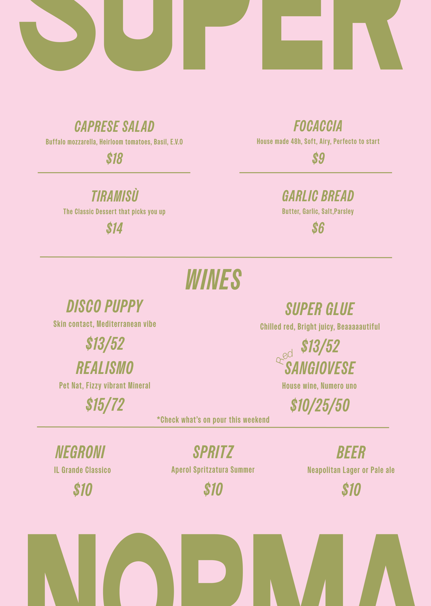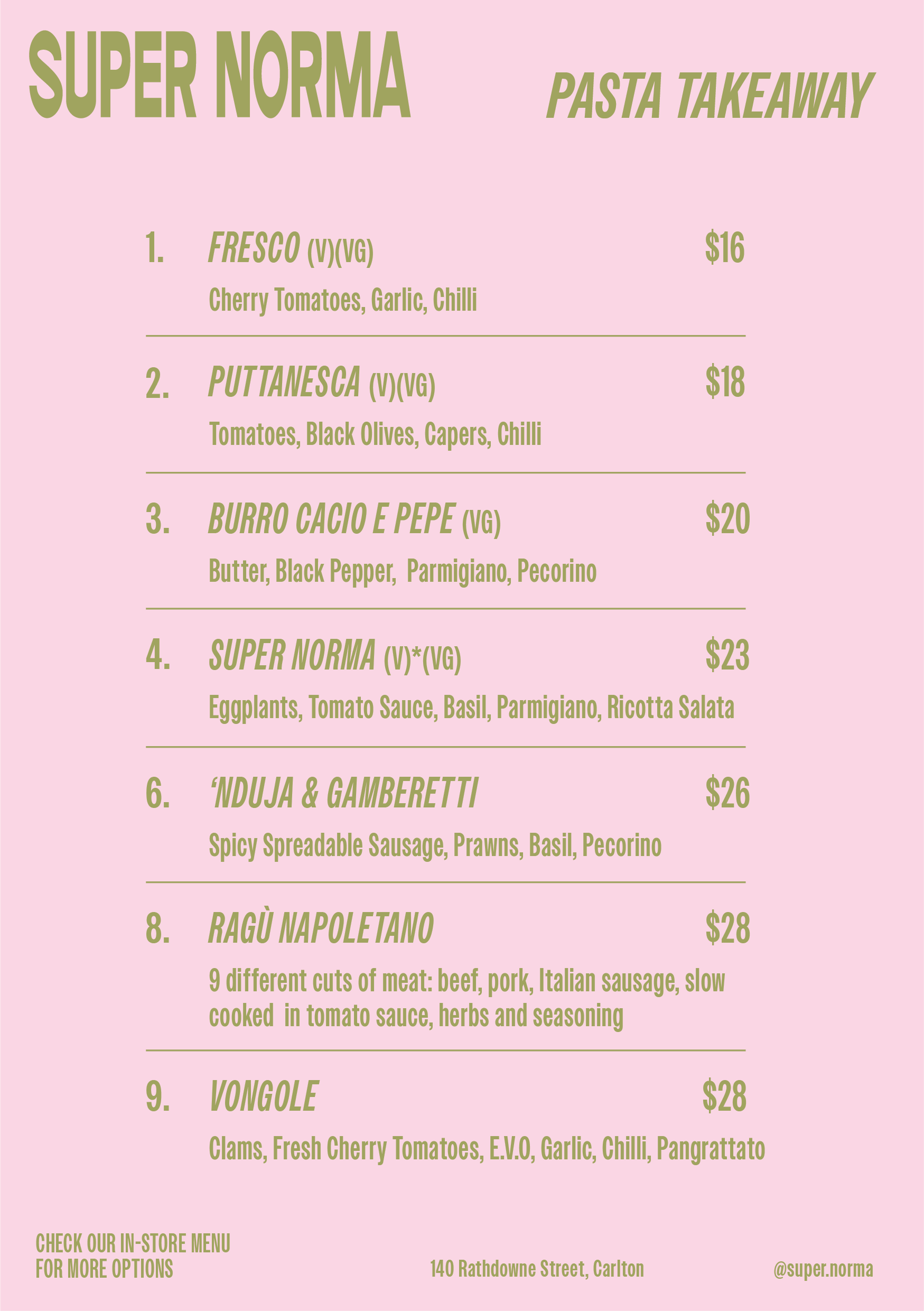 Cherry Tomatoes, Garlic, Chilli. Add Ons: Prawns +4, Parmigiano +2